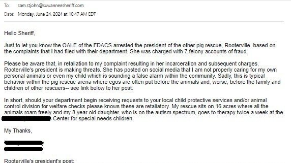 Please be aware that, in retaliation to my complaint resulting in her incarceration and subsequent charges, Rooterville's president is making threats. She has posted on social media that I am not properly caring for my own personal animals or even my child which is sounding a false alarm within the community. Sadly, this is typical behavior within the pig rescue arena where egos are often put before the animals and, worse, before the family and children of other rescuers-- see link below to her post.