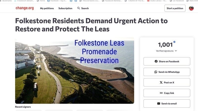 Mise à jour sur la pétitionFolkestone Residents Demand Urgent Action to Restore & Protect The Leas Sea Views !We Now Have One Thousand & One Reasons To Aim For 5000 Signatures !