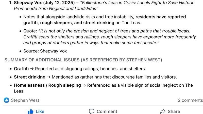 Mise à jour sur la pétitionFolkestone Residents Demand Urgent Action to Restore & Protect The Leas Sea Views !Michael Stewart From Brisbane Australia Shares His thoughts on my Shepway Vox Article & on the Leas.