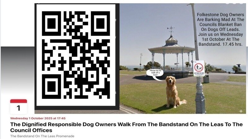 Please join us at 17.45 hrs. next Wednesday, 1st of October, at the Bandstand on the Leas. At 18.00 hrs., we will walk our dogs to the Folkestone & Hythe District Council offices, where councillors will be holding a meeting due to start at 1900 hrs. This isn't a protest or demonstration, it is a dignified dog walk to let the council know we are not happy as dog owners with their blanket ban on dogs off leads across much of the district. Several councillors agree with us that this is a discriminatory policy against all responsible dog owners.