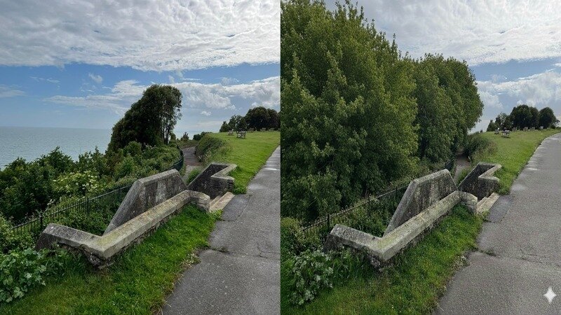 I can tell you that in the first photo, which is how it looks now, there is a clump of Holm Oaks in the immediate distance and a much larger clump further on, and once past the old toilets on Madeira Walk there is a wall of Holm Oaks stretching 400 yards or more where you can't see the sea and probably have not been able to for 15 years or so. At least 4 memorial benches at the west end of the Leas that once enjoyed views of the sea have been taken away by the council. Why would anyone want to sit on a bench looking at a wall of trees 6ft away?