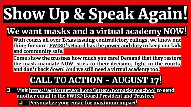 Thanks to the pressure applied by all of YOU--parents and community--a special FWISD board meeting has been called for this evening, Tuesday, August 17, at 6:00 p.m, at the Professional Development Center, 3150 McCart Ave (at Berry). The board will consider restoring the district's mask mandate and joining other litigation against the Governor's unconstitutional executive order.