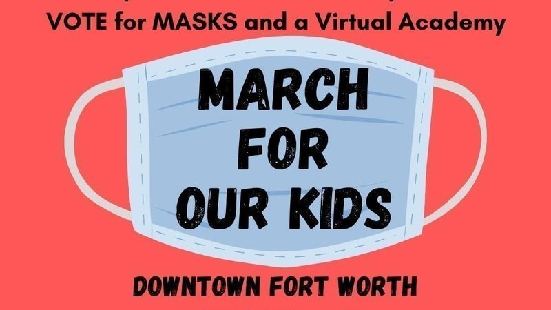 Come out today at 6:00pm to March for Our Kids in FWISD! We demand that the Board VOTE on a mask mandate and open up the virtual learning option to ALL students who need it! Tell the Board to stop playing political games and keep our kids and community safe! Please RSVP and share the Facebook event and this graphic!