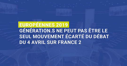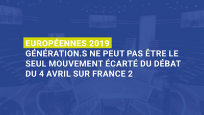 FRANCE 2 organise "Emission Politique" le 4 avril 2019. Le mouvement GENERATION.S fait parti du monde politique aujourd'hui, a des élus à l'Assemblée Nationale, au Sénat et au Parlement Européen. La Direction de FRANCE 2 a fait savoir que GENERATION.S ne serait pas convié à cette émission !!! Afin de respecter le pluralisme politique pour les prochaines Elections Européennes de mai 2019, la Direction de FRANCE 2 doit inviter l'ensemble des partis politiques ayant des représentants dans les différentes assemblées nationales et européenne. Ainsi GENERATION.S doit être invité à "Emission Politique" du 4 avril 2019 sur FRANCE 2.