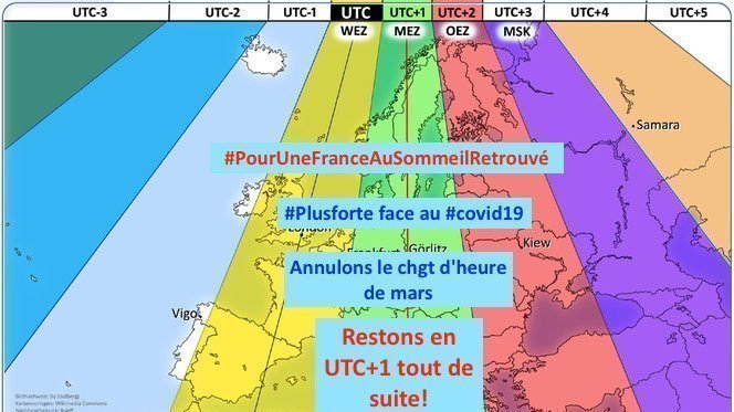 Prenez soin de vous, de vos proches. Mieux on sera confiné et respectera les précautions demandées, moins cela durera, moins de morts il y aura. Merci à ceux non confinés qui travaillent pour soigner et maintenir la société. Pour eux aussi, ne pas changer d’heure en mars, c’est mieux. En restant à UTC+1, cela sera bénéfique à court terme et pour le futur.