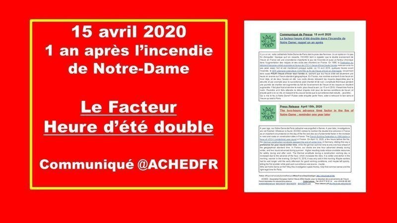 Обновление к петицииFRANCE: Signez svp contre le changement à l'heure d'été qui fatigue et n'économise pas15 avril 2020 -Le facteur heure d'été double dans l'incendie de Notre Dame