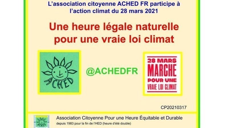 A signaler, dimanche 28, l’association ACHED a répondu à l’appel pour la "vraie loi climat". Disons le franchement, les 150 de la convention citoyenne ont été trompés et l’impact de l’heure légale trop avancée leur a été caché. Donc n'hésitez pas à aller les voir et discutez (gentiment) de l’opportunité de l’heure légale naturelle pour réduire les émissions de CO2. Si ils vous parlent électricité et éclairage dites leur bien que les rapports français écrits pour justifier la politique gouvernementale font l'impasse sur l'utilisation accrue de la voiture pour les déplacements au travail et de loisir, utilisation accrue aussi du chauffage en période froide, et de l'air conditionné en période chaude et que le total n'est pas du tout dans le sens annoncé et pas si petit qu'on nous le rabâche sans preuve. L'utilisation accrue de la voiture a aussi une incidence sur l'augmentation de la pollution même avec des véhicules récents.