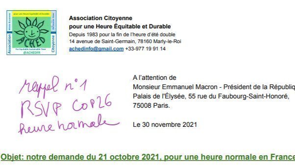 Envoyé semaine dernière, notre lettre de relance à Emmanuel Macron pour le retour à une heure normale. https://www.heure-ete.net/lettre20211130EM.pdf