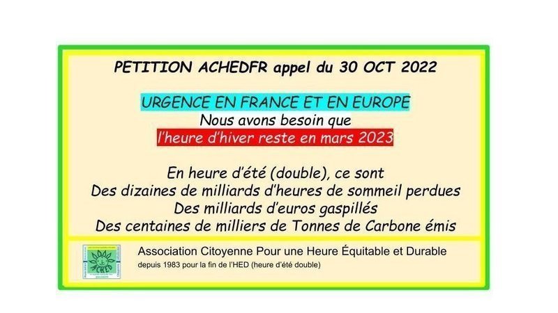 Appel mis à jour: "Que l'heure dite d'hiver reste en mars 2023, pour vraiment économiser et pour notre santé. En France et en Europe, en finir avec l' heure d'été hyper décalée et dépensière."