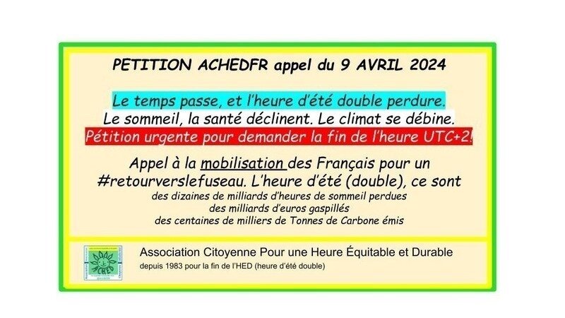 Mise à jour Pétition #retour vers le fuseau #pouruneFranceAuSommeilRetrouvé #teamHeureDurable avec l'ACHED
