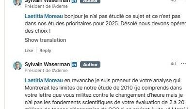 Malgré ma lettre recommandée d'octobre 2024 (http://heure-ete.net/CP20241023FR.pdf) où l'association ACHED demandait la rétraction du rapport ADEME 2010, il répond qu'il n'a pas étudié le sujet de l'heure d'été et que ce n'est pas dans ses priorités.