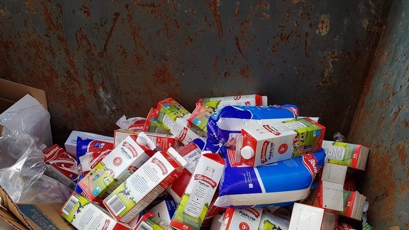 The reality is currently beyond fiction. These goods in the bottom of a bin were photographed just now, behind a Montreal business. As if the milk, the vegetables were not expensive enough like that! The employee who let us unload the bucket confesses, scandalized, to be forced to hide "this stuff" every night ...