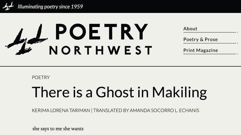 Some wonderful news. Poetry Northwest has published Amanda's translation of a poem by Kerima Lorena Tariman, titled "There is a Ghost in Makiling." Poetry Northwest is currently based in Oregon, and has been running since 1959.