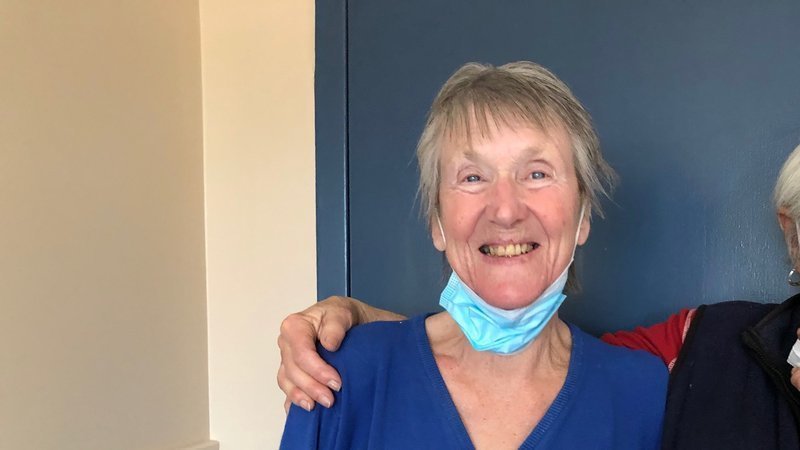 Photo: Eileen visiting with friend in hospital room, March 2022.