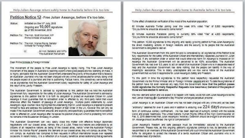 This petition: 10,000 signatories to this ongoing and rapidly growing petition to Free Julian Assange by the direct mediating actions in foreign relations and the security to its people that the Australian Government is obligated to deliver.