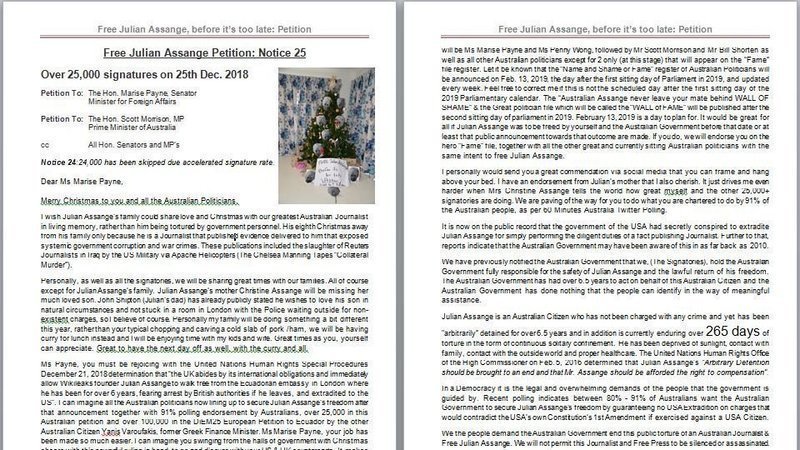 I am happy to announce, and feel free to also announce this in halls of parliament that, we the people involved in this “Free Julian Assange before it’s too late” petition, will be in 2019 naming and shaming the Australian politicians that have dismally failed in their obligated duties. Alternatively we will also be publicly rewarding and acknowledging the Hero politicians that are supporting the movement to Free Julian Assange. As a draft indicator (as of today’s positions) the first two names on the “Shame” list will be Ms Marise Payne and Ms Penny Wong, followed by Mr Scott Morrison and Mr Bill Shorten as well as all other Australian politicians except for 2 only (at this stage) that will appear on the “Fame” file register. Let it be known that the “Name and Shame or Fame” register of Australian Politicians will be announced on Feb. 13, 2019, the day after the first sitting day of Parliament in 2019, and updated every week. Feel free to correct me if this is not the scheduled day after the first sitting day of the 2019 Parliamentary calendar. The “Australian Assange never leave your mate behind WALL OF SHAME” & the Great politician file which will be called the “WALL of FAME” will be published after the second sitting day of parliament in 2019. February 13, 2019 is a day to plan for. It would be great for all if Julian Assange was to be freed by yourself and the Australian Government before that date or at least that public announcement towards that outcome are made. If you do, we will endorse you on the hero “Fame” file, together with all the other great and currently sitting Australian politicians with the same intent to free Julian Assange.