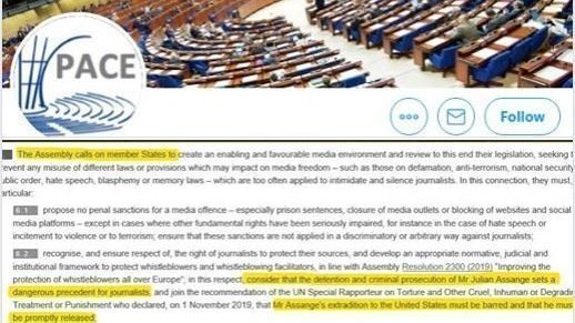 The @CoE Assembly, in a resolution on media freedom, declares that the detention and prosecution of @wikileaks founder Julian #Assange "sets a dangerous precedent for journalists" and calls for his prompt release. The full resolution: