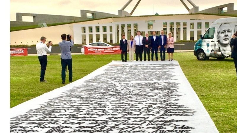 See some of the members of the Bring Assange Home Parliamentary Group that were together with the team from Australians For Assange outside the Australian Parliament this week with an unrolling of a great/awesome artistic representation of the Free Julian Assange, before it's too late Petition. Parliamentarians present were Peter Whish Wilson, Helen Haines. Steve Georganas, Rebekha Sharkle, Julian Hill. Andrew Wilkie and George Christensen.