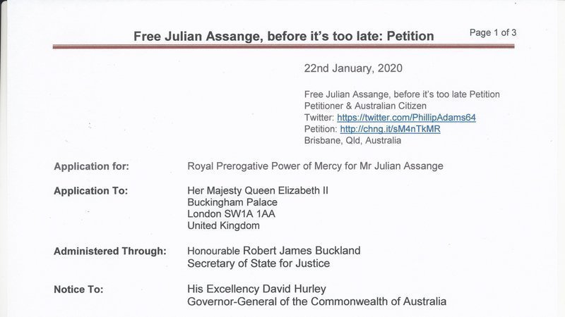 On 12th Nov. 2019 and on behalf of over 250,000 Signatories this petition to free Julian Assange was tabled in the Australian Parliament requesting immediate senior diplomatic intervention. This petition is now the 4th largest petition to have been successfully tabled in the history of the Australian Parliament, reflecting strong community support. In the interests of Human Rights, Democracy and British sovereignty we now also extend a formal request of a Prerogative of Mercy from Her Majesty Queen Elizabeth II to free Julian Assange.