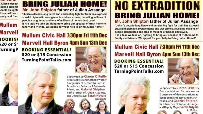 Hi All, Friday 11 Dec: No Extradition! Bring Julian Home, Mullumbimby Civic Hall, 7.30pm. Featuring John Shipton, Ciaron O'Reilly, ++ (I'll be there). Sunday, 13 December: No Extradition! Bring Julian Home at Byron Marvell Hall, 4pm. Featuring John Shipton, Ciaron O'Reilly, (I'll be there too).
