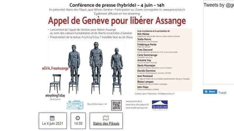 C’est au nom des valeurs humanitaires enracinées à Genève, Cité de paix et des droits de l’homme, qu’une dizaine de personnalités, dont le rapporteur spécial des Nations Unies sur la torture Nils Melzer et la Maire de Genève, se mobilisent le 4 juin prochain pour lancer l’“Appel de Genève pour libérer Assange” #GVA_FreeAssange. La statue “AnythingToSay dédiée aux lanceurs d’alerte Edward Snowden, Chelsea Manning ainsi qu’à Julian Assange sera en même temps installée sur la jetée des Pâquis face au Jet d’eau de Genève.