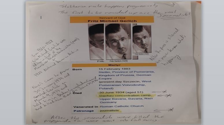 Fritz Michael Gerlich (journalist/publisher and frmr Editor in Chief Munich news publication) was tortured to death by Nazi's in 1933-1934 in Dachau Concentration Camp for exposing the evil Nazi plan of Hitler in the lead up to WWII. After the real journalists are permanently silenced, then the world was on a Nazi propaganda ruled roadmap for WWII.