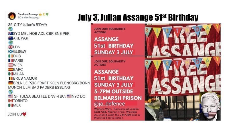 For a list of some of the events scheduled to celebrate Julian Assange's Birthday around the world click here or add your event click here too:https://twitter.com/Candles4Assange/status/1543020257123930112?s=20&t=E4su0kE0_6HgFocvTCYEug