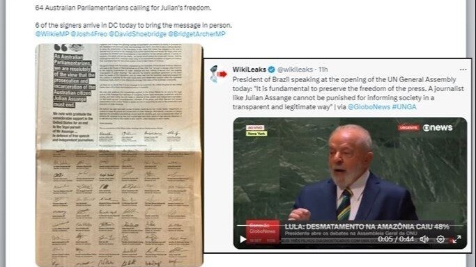 "President of Brazil speaking at the opening of the UN General Assembly today: "It is fundamental to preserve the freedom of the press. A journalist like Julian Assange cannot be punished for informing society in a transparent and legitimate way" | via @GloboNews #UNGA" https://x.com/wikileaks/status/1704140884944494662?s=20