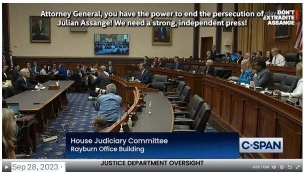 Attorney General of the USA grilled in House Judicial Committee. ““Freedom of the press! Attorney General, you have the power to end the persecution of Julian Assange! We need a strong, independent press!” Source: https://x.com/Stella_Assange/status/1707153723380637786?s=20