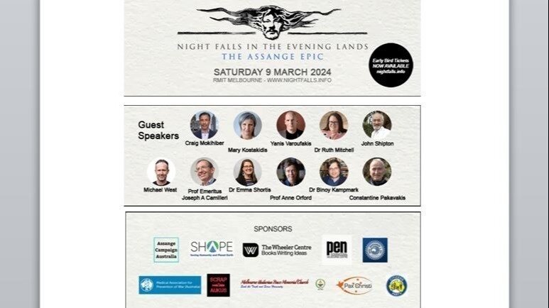 Regardless of where you are around Australia and the world, join us at Night Falls in the Evening Lands: The Assange Epic, either in person or virtually and hear from influential speakers featured below - you can check out their detailed bios on the event website. (https://www.nightfalls.info/)