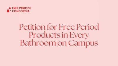 Period products are a health necessity for many people attending Concordia University. Both pads and tampons should be offered for free in every single bathroom so that every person who needs them can access them easily and comfortably.