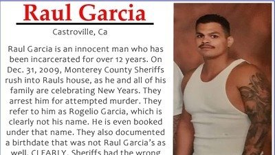 On the late evening of December 31, 2009, the Monterey County Sheriffs respond to a residence where a shooting had occurred. No one was hurt, but 9 shots had been allegedly fired. The alleged victims lived down the street from Raul Garcia and his family. Minutes after leaving the residence of the victims, Sheriffs arrive at Raul Garcia's house. And the chaos began. The sheriffs call out for Rogelio Raul Garcia. They charge at Raul Garcia. Raul is literally dragged out of his family's home, dragged through an alleyway, and put into the Sheriffs patrol car. Everyone could hear Raul screaming. They tell Raul's family that Raul is being arrested for attempted murder. Raul's family tell Sheriffs that Raul had been there the entire time and could not have done it. The family requests the Sheriff do a Gun Reside Test to prove Raul Garcia did not shoot a gun. The Sheriffs refused to do so, saying they were already "working overtime." Raul was arrested for attempted murder and booked as Rogelio Garcia. Sheriffs even documenting a different birthdate.
