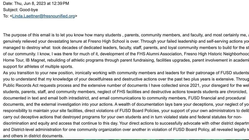 The purpose of this email is to let you know how many students , parents, community members, and faculty, and most certainly me, are genuinely relieved your devastating tenure at Fresno High School is over. Through your failed leadership and self-serving actions you have managed to destroy what took decades of dedicated leaders, faculty, staff, parents, and loyal community members to build for the students of our community. I know, I was there for much of it, development of the FHS Alumni Association, Fresno High Historic Neighborhood Holiday Home Tour, IB Magnet, rebuilding of athletic programs through parent fundraising, facilities upgrades, parent involvement in academic support for athletes of multiple sports. As you transition to your new position, ironically working with community members and leaders for their patronage of FUSD students, I want you to understand that my knowledge of your deceitfulness and destructive actions over the past two plus years is extensive. Through the Public Records Act requests process and the extensive number of documents I have collected since 2021, your disregard for the welfare of students, parents, staff, and community members, neglect of FHS facilities and destructive actions towards students are chronicled, documented in text and email both intradistrict, and email communications to community members, FUSD financial and procedural documents, and the external investigation into your actions. A wealth of documentation lays bare your deceptions, your neglect of your responsibility to maintain your site facilities, direct violations of FUSD Board Policies, your support of your own administrators to deliberately carry out deceptive actions that destroyed programs for your own students and in turn violated state and federal statutes for non-discrimination and equity and access that continue to this day. Your direct actions to successfully advocate with other district departments, and District-level administration for one community organization over another in violation of FUSD Board Policy, all revealed legally to me and others in district documents.