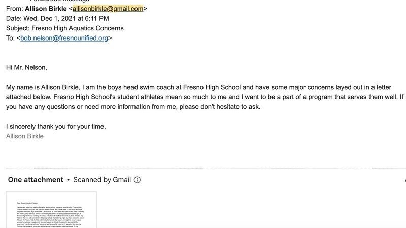 I appreciate your time reading this letter laying out my concerns regarding the Fresno High School Aquatics program. My name is Allison Birkle, and I have been a part of the aquatics program at Fresno High School for 3 years both as a volunteer and paid coach. I am currently the Head Coach for Boys Swim. I am writing because I am disappointed and distraught at Fresno High School’s handling of various situations that affect their own student athletes. My hope is that you will consider the following to help make things right. My main concerns are as follows: 1) Fresno High School Administration’s lack of program oversight to ensure equal access to necessary equipment, financial equity, and lack of support in general; 2) the seemingly intentional gutting of a diverse and accessible community aquatics club serving Fresno High students, oncoming students and the surrounding neighborhoods; 3) the thoughtless and punitive response from Fresno High School’s Administration by eliminating an inclusive program model that supported student athletes of all genders, sexual orientation, race, and socio-economic background, and replacing it with a model that focuses on differences and exclusion.