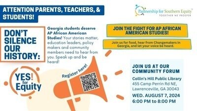 On Monday, July 22, Gwinnett County Public Schools announced the sudden discontinuation of funding for the AP African American Studies (AAS) course. This news was shocking and disheartening for me, a Black student, and for alumni, parents, and other students. The Partnership for Southern Equity's YES! for Equity condemns this decision, along with the prior one by the Georgia Department of Education Superintendent.