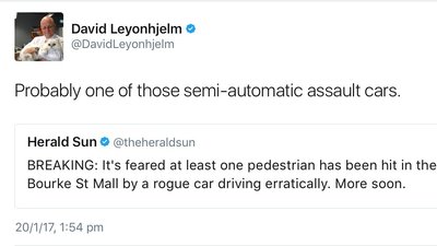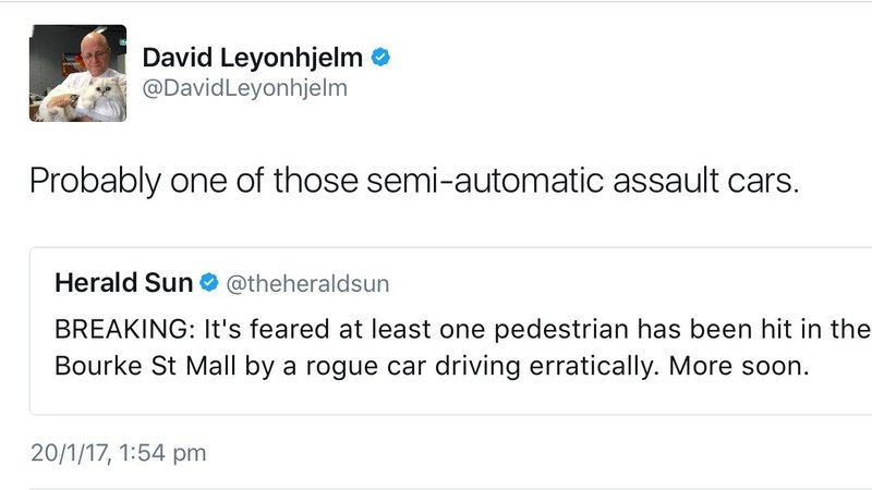 In response to an article published on Twitter by the Herald Sun regarding the attack, Senator David Leyonhjelm of the Liberal Democratic Party tweeted "Probably one of those semi-automatic assault cars."