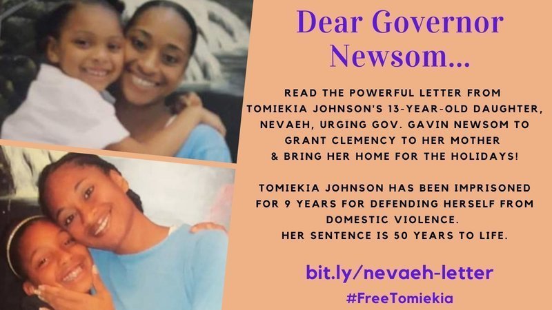 As we enter the holiday season, Tomiekia Johnson's 13-year-old daughter, Nevaeh Savannah Lemons, sent a heartfelt letter to Governor Gavin Newsom describing the impact of the 9-year absence of her mother. Tomiekia has been incarcerated since 2012 after defending herself from domestic violence. Tomiekia’s sentence is 50 years to Life. An excerpt from Nevaeh's letter is below: