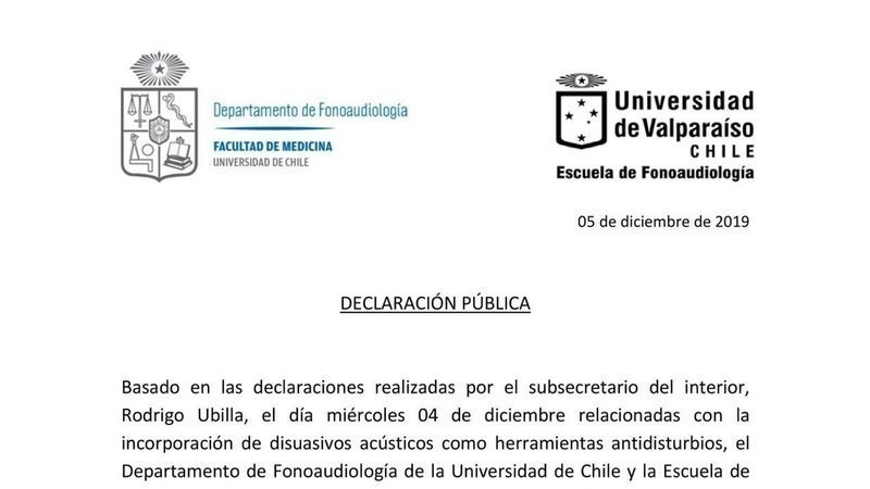 A las armas químicas y de disparo a fuerte cinética nuevamente autorizadas, el gobierno chileno pretende incorporar disuasivos acústicos como herramientas antidisturbios con el propósito de generar daños irreversibles de la audición, que se sumaran a las heridas en los ojos por balines de más de 350 personas. A más de 50 días de reivindicaciones sociales, el gobierno no ha dado ninguna respuesta. Es más, continúa tratando de callar el estallido social con la violencia indiscriminada de las fuerzas policiales, a las cuales se les asegura la impunidad frente a las violaciones sistemáticas de los derechos humanos. Las armas autorizadas por el gobierno chileno contra civiles van en contra de las alertas de médicos, científicos y hombres de ley.