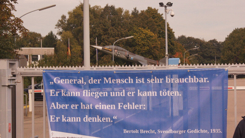 Die Friedenskräfte fordern die Unterschrift Deutschlands unter den Atomwaffen-verbotsvertrag sowie die Vernichtung der nuklearen Arsenale der USA in Büchel in der Eifel und somit das Ende der völkerrechtswidrigen deutschen „Nuklearen Teilhabe“. Wir Militärkritiker sehen in nuklearen Arsenalen keinen Sicherheitsschirm, sondern ein Damoklesschwert über unserem Leben.