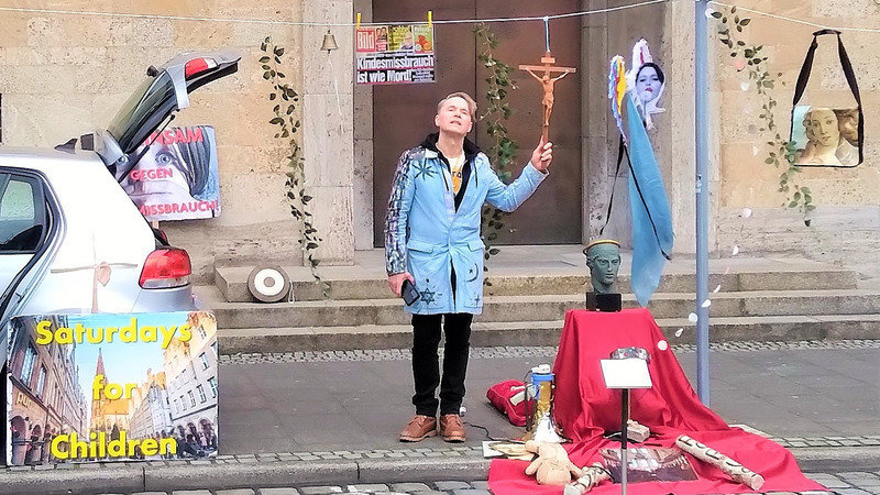 Das Wetter spielte mit, und so konnte ich einen Teil meiner Aktionskunst direkt vor Frau Präses der EKD, Dr. h. c. Annette Kurschus' Arbeitsplatz, dem Landeskirchenamt der Evangelischen Kirche Westfalen, aufbauen. Keiner der Mitarbeiter*innen kam heraus um mit uns zu sprechen. Nennt man so etwas "lebendige Aufarbeitung" eines unfassbaren Verbrechens an den allerjüngsten Mitgliedern, den Kindern die als "evangelisch" gelten?! Unsere nächste Station wird am 22.04.2023, von 15:00 bis 17:00 Uhr der Platz vor dem Osnabrücker Dom sein.