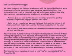It's time for California to send a powerful message to our elected representatives, to remind them that We, The People, are their employer. We at Total Recall 2009 believe the public sector work force should be held accountable for poor job performance just as we in the private sector are. By filling in the form below with your contact information, you can send a personalized Pink Slip to Governor Schwarzenegger or your local representative directly via either standard or e-mail. Simply fill out the information below and then click "Create Pink Slip" to send YOUR notice of intent to terminate.