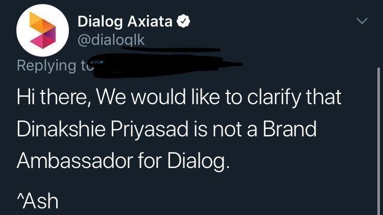 Thank you to Dialog Axiata for listening to us and removing Dinakshie Priyasad as their ambassador.