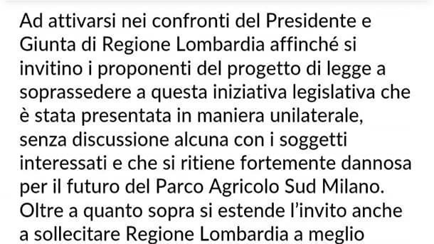 Actualización de la peticiónGiù le mani dal Parco Agricolo Sud MilanoAnche il Consiglio comunale di Milano dice no al progetto di legge regionale sul Parco Sud