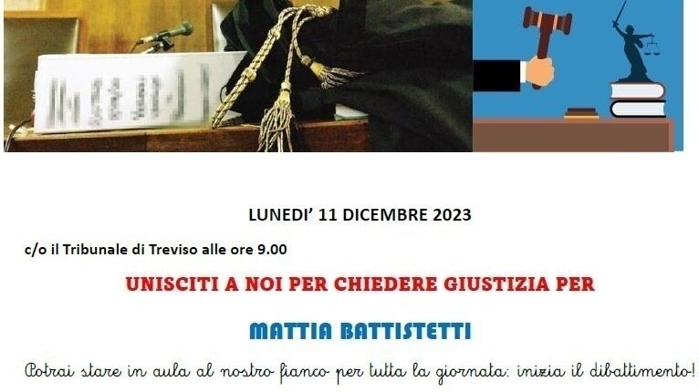 Lunedì 11 dicembre 2023 presso il tribunale di Treviso alle ore 9.00 unisciti a noi per chiedere giustizia per Mattia Battistetti. Potrai stare in aula al nostro fianco per tutta la giornata: inizia il dibattimento!