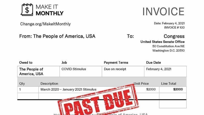Today is the day. Organizers around the country are braving crazy weather and this pandemic to deliver our signatures directly to key lawmakers across the country. It’s not too late to join in! You can digitally send your past due invoice on Twitter. Click here, and don’t forget to tag your senators!