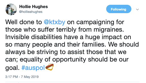A great #MigraineLove message of support from lead Liberal Party candidate for the Senate in NSW, the wonderful Hollie Hughes. Hollie has a great track record of advocating for all kinds of people with different disabilities, including founding the Country Autism Network - she gets it.