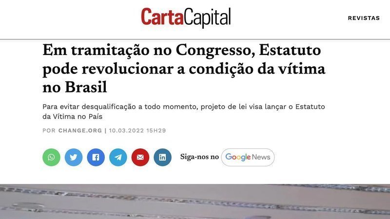News alertBasta de violência! Pela aprovação do Estatuto da Vítima - PL 3890/20!Saiu na CartaCapital! Em tramitação, Estatuto pode revolucionar a condição da vítima no Brasil