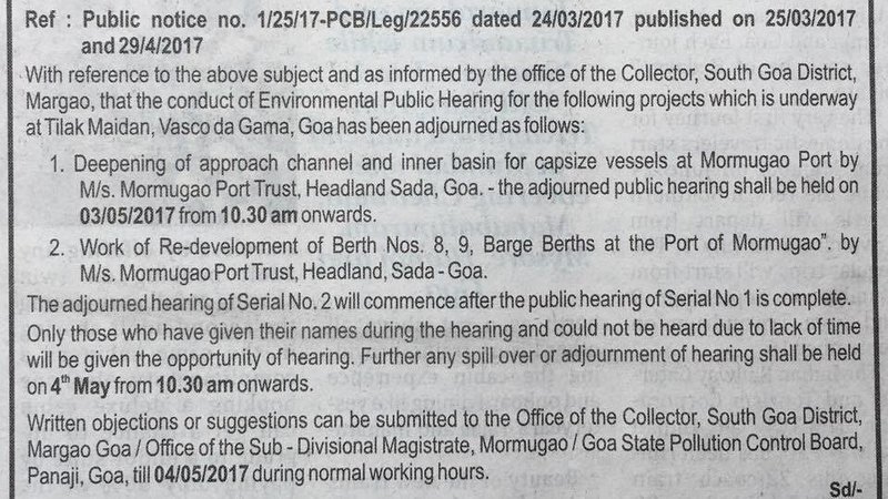Goa State Pollution Control Board - Public Notice for conduct of Environmental Public Hearing. (Attached Newspaper Clipping)