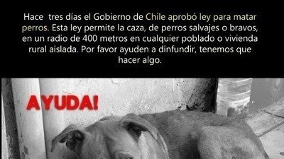 Como argentino esto no me incumbe para nada...pero hace poco me entere de la terrible noticia que el el gobierno chileno aprobo la ley que permite la caza de perros salvajes o bravos,en un radio de 400 metros en cualquier poblado o vivenda rural aislada.