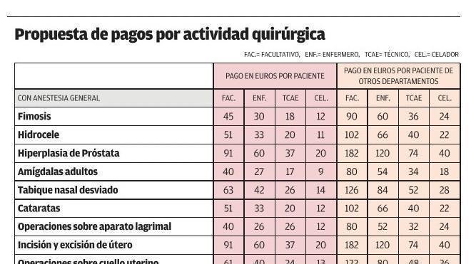 Sueldo Bruto por una intervención, ya no es solo los médicos, es que un celador pasa a cobrar DIEZ EUROS. Un auxiliar VEINTE. Una enfermera 60!!!